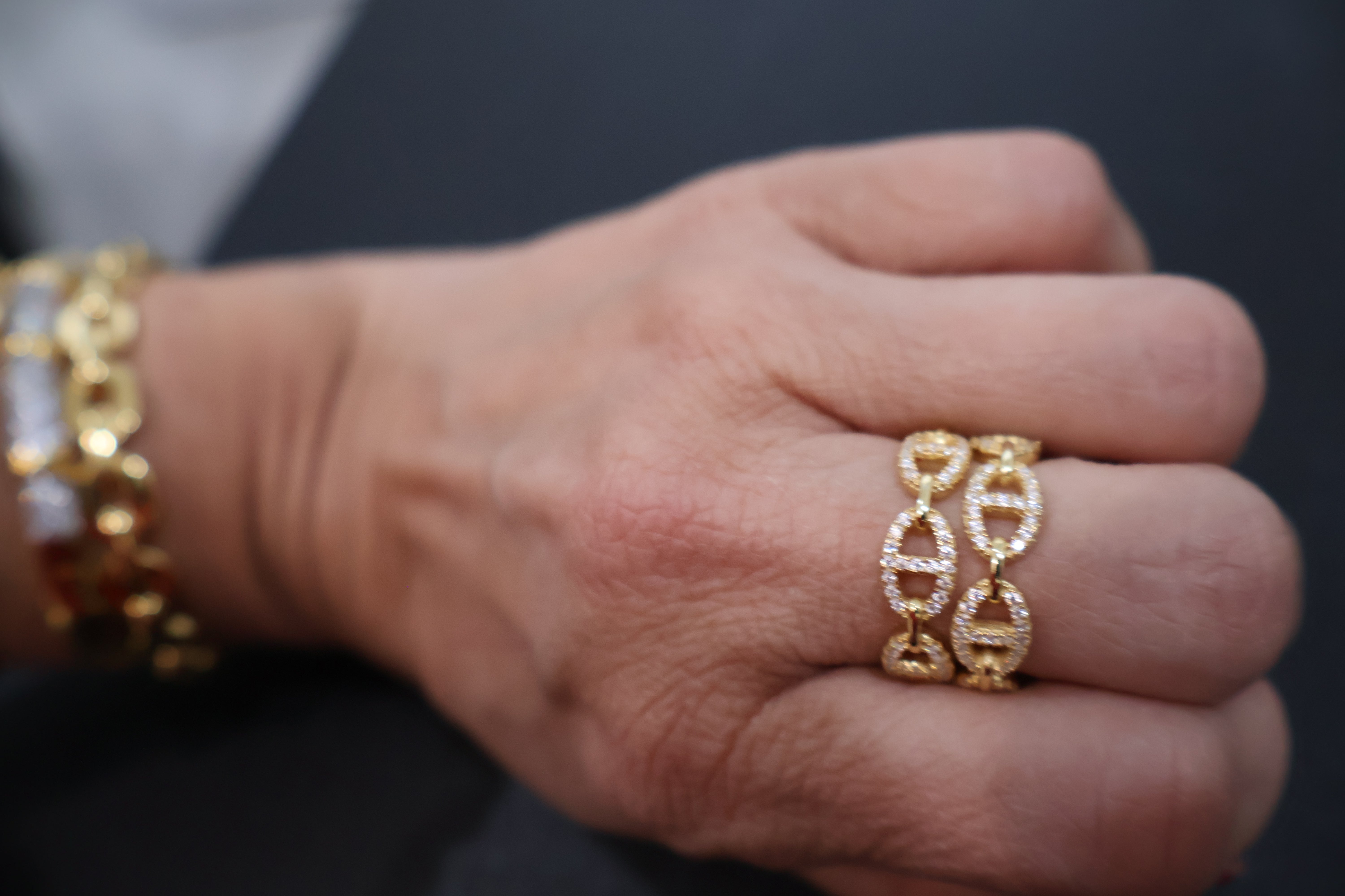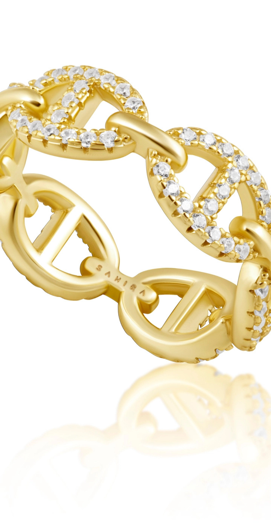 Dare to shine with the Pavé Rosie Link Ring—a striking fusion of bold design and refined elegance. Featuring a distinctive chain link silhouette encrusted with dazzling CZ stones, this ring commands attention with every gesture. Its sculptural form and luxe sparkle make it a true statement piece, perfect for those who embrace style with confidence and edge. Elevate your look with a ring that speaks volumes—glamorous, fearless, and unapologetically you.